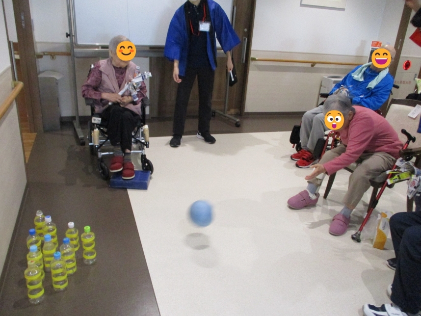 ご利用者様の選手宣誓から始まり、ボール送りとボーリングの2種類の競技を行いました。