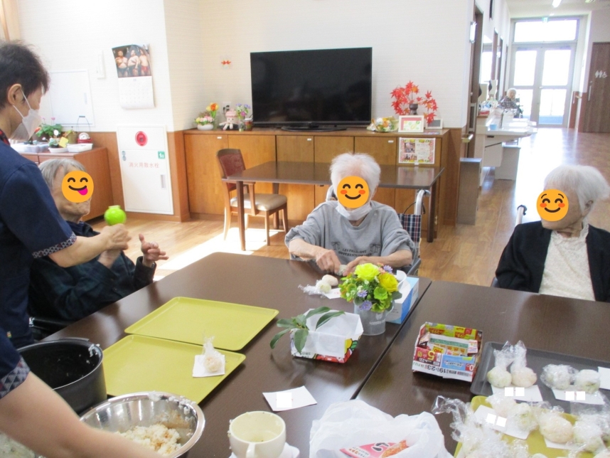 運動後はご利用者様とおにぎりを握り、お弁当につめて提供しました。