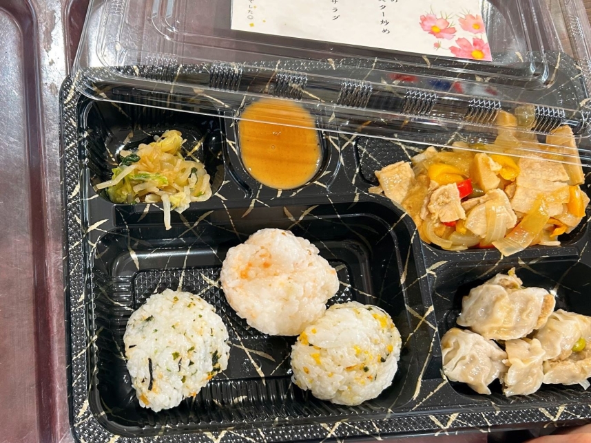 皆さん一緒に共有スペースでお弁当を食べ、ほとんどの方が完食されていました**