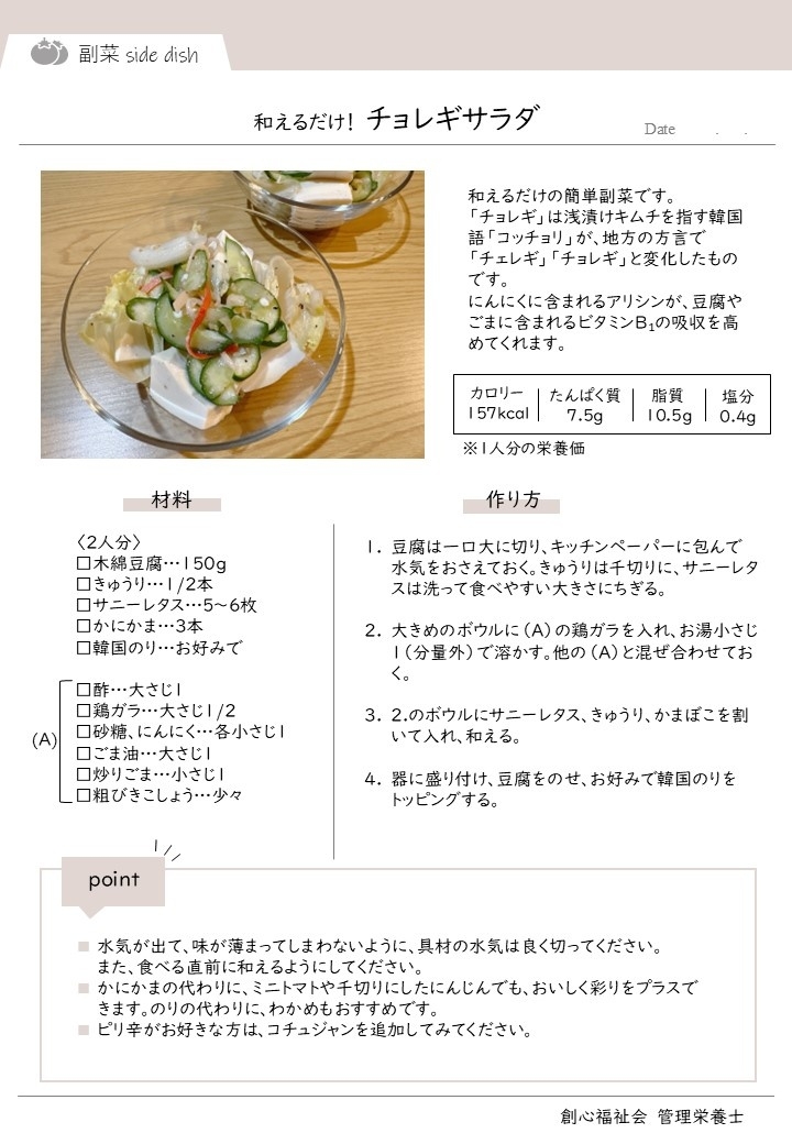 その中から、手作り経口補水液と、豆腐のチョレギサラダを試食として提供しました。