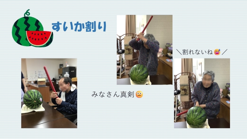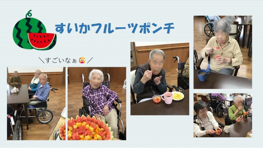 【くらしき日和平田】おやつ作り 2025.07.23 この大きいすいかはご家族よりいただきました** 作る前に、すいか割りを実施!みなさんに叩いていただきました。 普通に切って食べるのもいいけど、せっかくなので、フルーツポンチにして食べましょう! スイカの器は管理栄養士の力作です! すいかをくり抜き、食べやすいようにできる限り種を取り除き、果物缶とサイダーと合わせました。o○ 「すごいな~」「大きいな~」みなさまの驚く顔が見られました☺