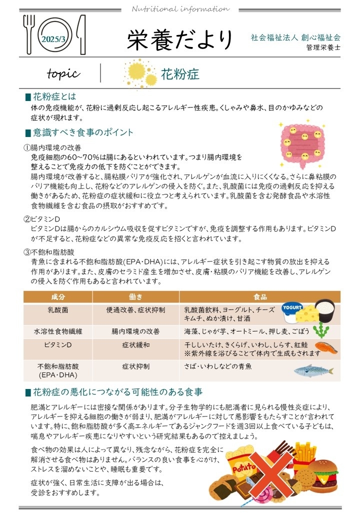 【3月栄養情報】 2025.03.21 こんにちは!管理栄養士です☺ だんだんと暖かく過ごしやすい気候になってきましたね。しかし、この時期は花粉が気になりますよね。 3月栄養だよりは花粉症についてです。 花粉症を解消する食品はありませんが、意識して取り入れることで、症状が軽減される可能性のある食品を掲載しています。 食事だけでなく、ストレスを溜めないこと、十分な睡眠をとることも重要です。