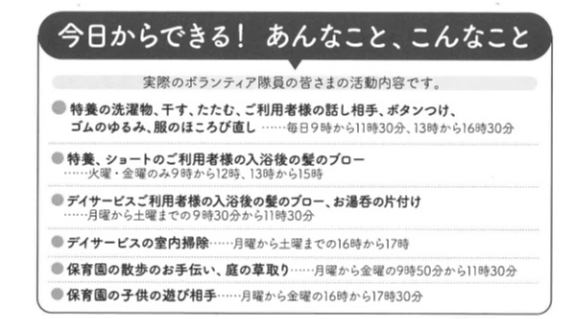 ボランティア募集 2023.07.04 創心福祉会ではボランティアを募集しています! 地域に貢献してみたい・・・ボランティアをやってみたいがどこでできる?なにができるかわからない方! 特技を生かして、すき間時間にボランティアをしてみませんか? この内容以外にも、大募集中です!!! ボランティアしてみませんか?