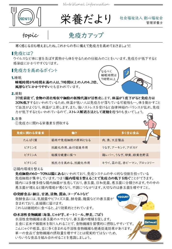 【11月栄養情報・レシピ紹介】 2024.11.12 こんにちは。施設管理栄養士です。11月になり、寒く感じる日も増えましたね。 冬に備えて免疫力を高めておきましょう! レシピも掲載しています。参考になれば幸いです☺