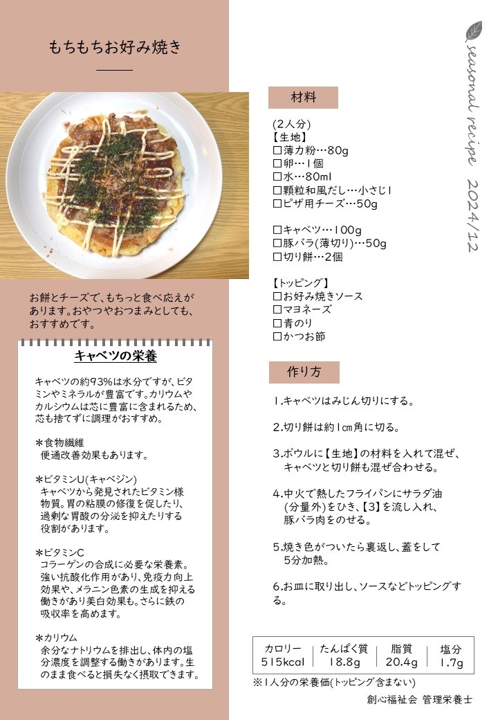 お餅を使ったお好み焼きのレシピです。
