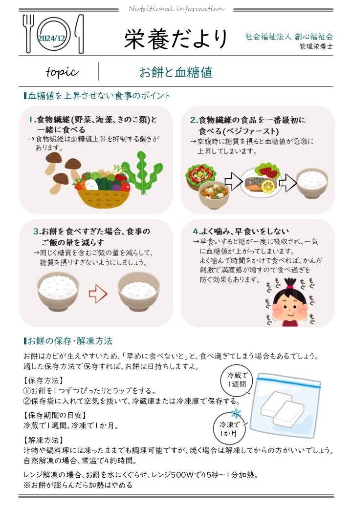 今月の栄養情報は、お餅と血糖値についてです。