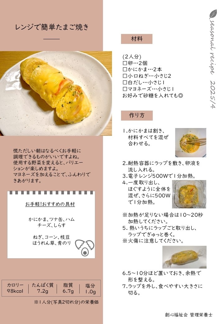 【4月栄養情報・レシピ紹介】 2025.04.21 新年度になりましたね! 体調を整えて一日を活動的に過ごすためには、朝ごはんをしっかり食べることが大切です。ご自身の朝食を見直してみませんか? 朝食は様々な役割があり、体内リズムを整えてくれます。午前中の活動に大きく関係しています。 レンジで簡単に調理できる卵焼きのレシピも掲載しています** Cookpadにもレシピを掲載しています。のぞいてみてください☺ https://cookpad.com/jp/users/107539527