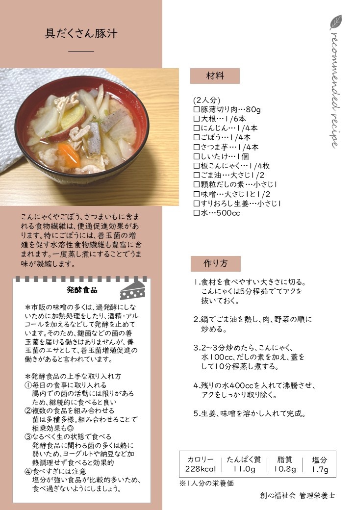 食物繊維が豊富な豚汁のレシピを掲載しています。