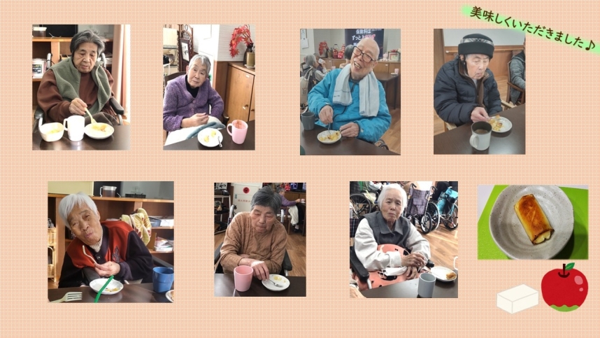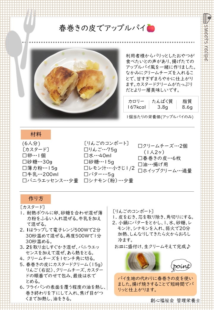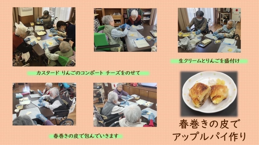 1月は特養にて「春巻きの皮でアップルパイ風」を作りました。入所者様と一緒に春巻きの皮の上にカスタードクリーム、りんごのコンポート、クリームチーズをのせて、包んでいただきました。揚げ焼きにすると、よい焦げ目がついてパリッとしていて、とても美味しそうに仕上がりました。「できたてはいいね」「もっと食べたい」というお声があって、とても喜ばれていました。
