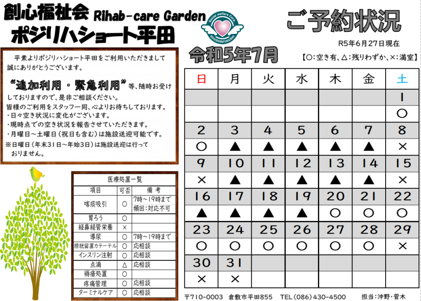 ショートステイの空き状況をご案内いたします。最新の情報についてはお問い合わせください。