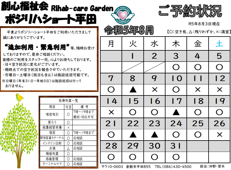 ポジリハショート平田 令和7年8月の空き状況