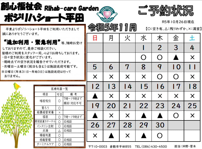 ポジリハショート平田 11月空き状況 2023.10.27 空き情報更新が滞っており、申し訳ありません。 ショートステイの空き状況をご案内いたします。最新の情報についてはお問い合わせください。 次回は11月15日に更新予定です。
