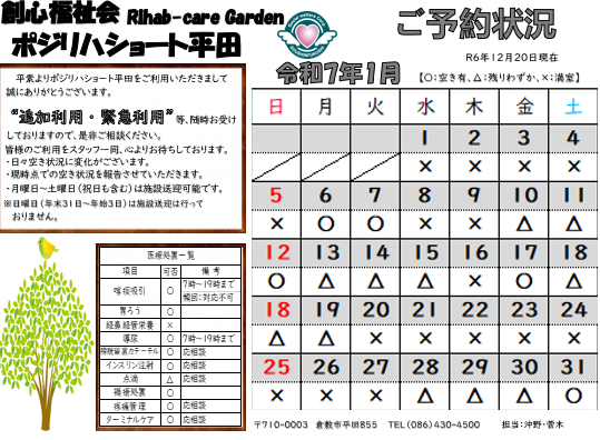 ポジリハショート平田 令和7年1月の空き状況 2024.12.20 ショートステイの空き状況をご案内いたします。 特養併設のため、重度及び医療対応が必要な方でも受け入れ可能です。 詳細については担当者までお問い合わせください。