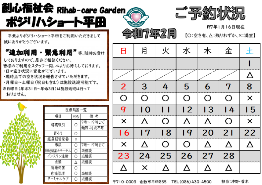 ポジリハショート平田 令和7年2月の空き状況 2025.01.16 ショートステイの空き状況をご案内いたします。 特養併設のため、重度及び医療対応が必要な方でも受け入れ可能です。 詳細については担当者までお問い合わせください。