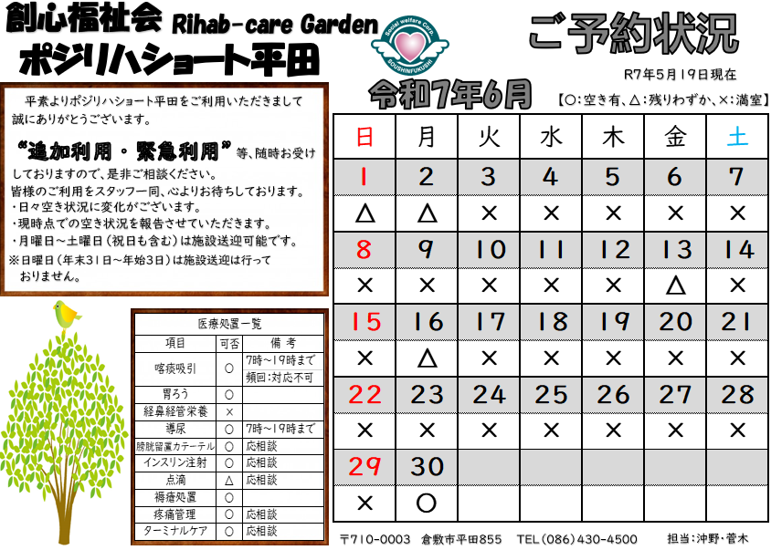 ポジリハショート平田 令和7年6月の空き状況 2025.05.19 ショートステイの空き状況をご案内いたします。 特養併設のため、重度及び医療対応が必要な方でも受け入れ可能です。 6月についてはご予約を多数いただき、空室は残りわずかです。 詳細については担当者までお問い合わせください。