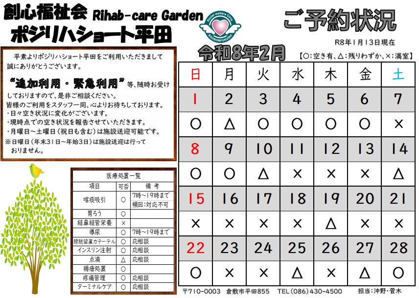 ポジリハショート平田 令和8年2月の空き状況 2026.01.13 ショートステイの空き状況をご案内いたします。 特養併設のため、重度及び医療対応が必要な方でも受け入れ可能です。 2月については月初に空室が多くあります。 詳細については担当者までお問い合わせください。