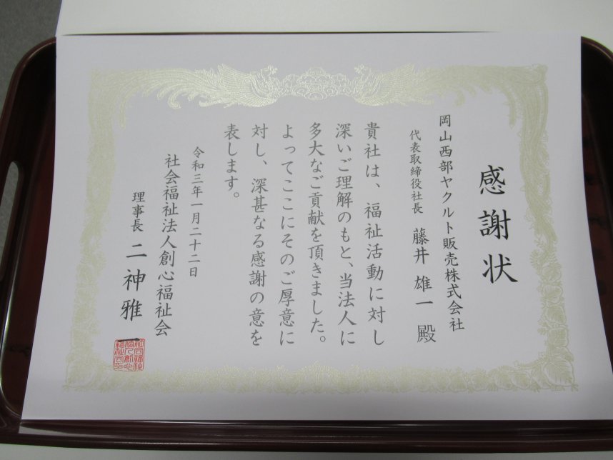 日頃から福祉活動にご理解を頂いている岡山西部ヤクルト販売㈱様から車椅子を寄贈頂きました。ありがとうございました。