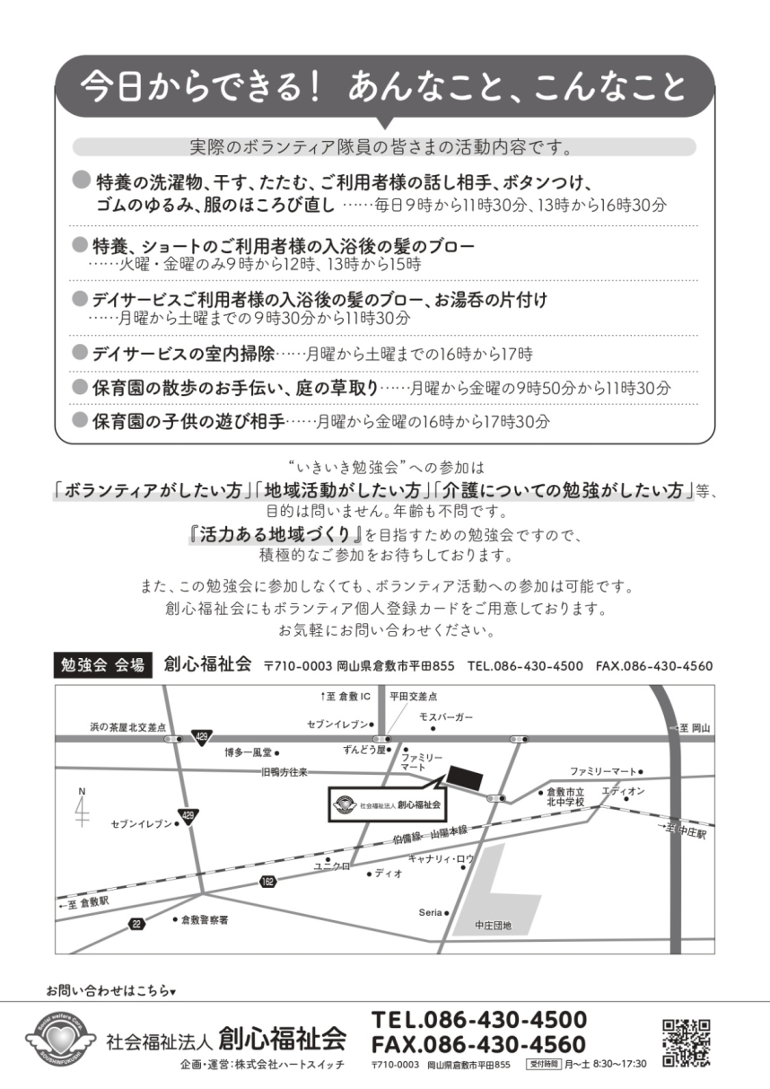 私たち、創心福祉会では、元気にお手伝いしてくださる地域の皆さま、学生さん、介護に興味をお持ちの方を募集しています。